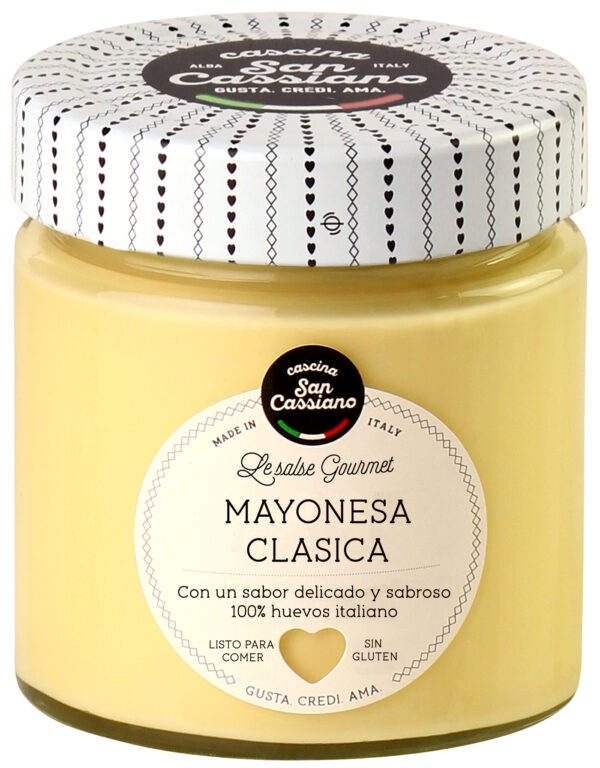 Mayonesa clásica, cremosa, preparada siguiendo la receta clásica con huevos, aceite y limón. Para preparar aperitivos, maridar con carne, pescado y verduras.