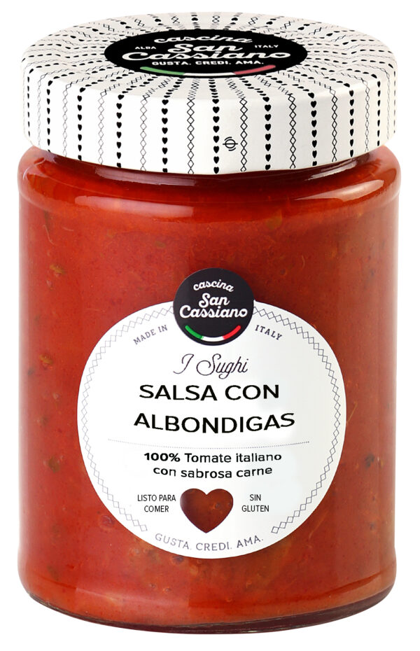 Salsa hecha con suaves y sabrosas albóndigas de ternera y tomates 100% italianos. Esta es una receta antigua típica del sur de Italia, conocida en todo el mundo como un acompañamiento típico para spaguetti.